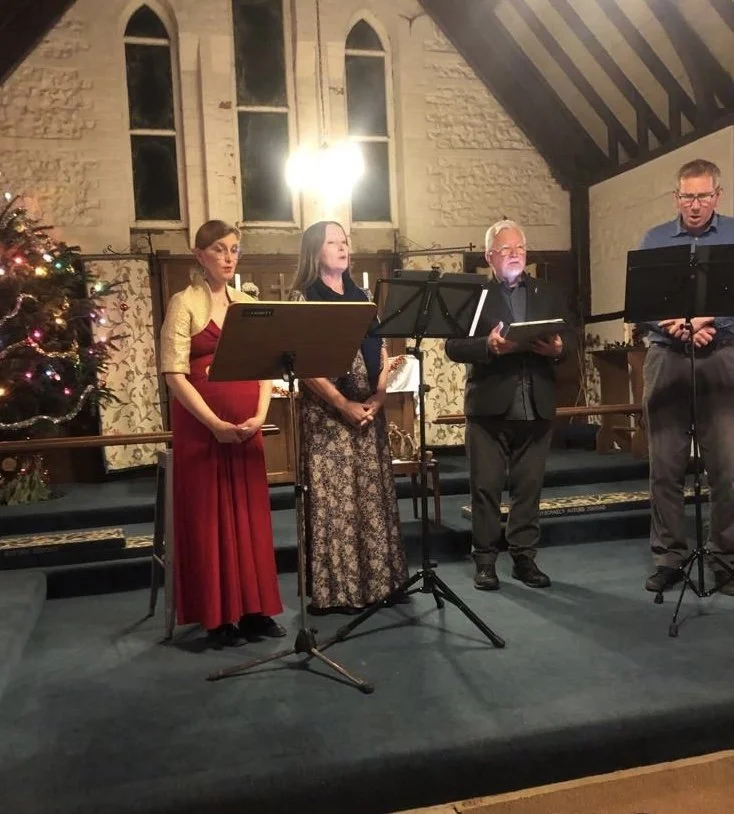 Pictured below with Amity Ensemble musicians Max More, Piano and Tam Coates, Violin. Summer is nice but no stranger to cold churches!