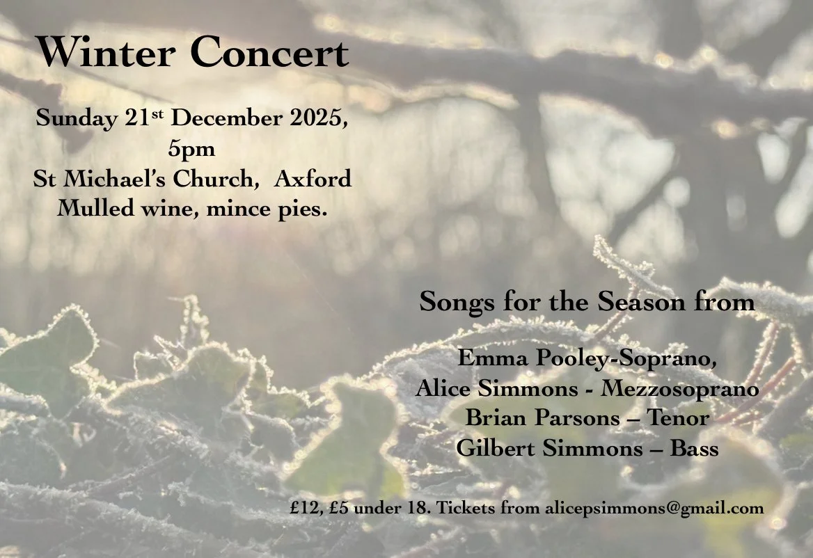 St Michael’s, Axford, 6:30 pm Winter Concert, seasonal classical song, with Jane Hunt, soprano, Din Ghani, lute, Brian Parsons, tenor, piano